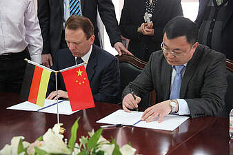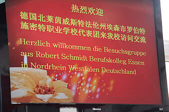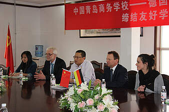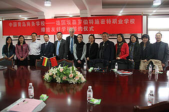 Nach einem erfolgreichen Vorbereitungstreffen im vergangenen Jahr in Zwickau flog eine vierköpfige Delegation des Robert-Schmidt-Berufskollegs der Stadt Essen am 15.03.2013 nach Qingdao/China, um mit der dort ansässigen Qingdao Commerce School eine Schulpartnerschaft zu vereinbaren. Ziele dieser langfristig angelegten Schulpartnerschaft sind die fachliche Kooperation in allen Handlungsfeldern logistischer Abläufe, der kulturelle Austausch zwischen den Lehrer-/innen und Schüler-/innen sowie Auszubildenden beider Schulen und die Anbahnung und Vertiefung von sozialen Kontakten. Dabei ist ein weiterer Aspekt für eine weit in die Zukunft angelegte Zusammenarbeit ebenso interessant: Qingdao ist eine der Partnerstädte der Stadt Essen. Wobei die Unterschiede zwischen den Städten größer nicht sein können. Qingdao mit seinen ca. 9 Mio. Einwohnern gilt mittlerweile als eine der weltgrößten Hafenstädte und rangiert bezogen auf die umgeschlagene Tonnage vor Rotterdam. Die Stadt im Nordosten Chinas ist logistische Drehscheibe und industrieller Standort zugleich. Dagegen glänzt die Stadt Essen als Dienstleistungszentrum im Herzen des Ruhrgebietes. Gerade diese Gegensätze bieten den Akteuren beider Schulen erhebliche Chancen in vielen Bereichen voneinander zu lernen und zu profitieren. Während des mehrtägigen Aufenthaltes in Qingdao hat die Delegation des Robert-Schmidt-Berufskollegs einen Eindruck davon gewinnen können, wie ausgesprochen gastfreundlich, leistungsstark und den modernen technologischen Entwicklungen gegenüber aufgeschlossen die chinesischen Partner sind. Im Rahmen mehrmaliger Besuche der Qingdao Commerce School wurden die Inhalte der Schulpartnerschaft verhandelt. Am 18.03.2013 konnte die Kooperationsvereinbarung der Schulen in Anwesenheit eines Vertreters des Schulamtes der Stadt Qingdao sowie des Erziehungsministeriums der Provinz Shandong zwischen den beiden Vertretern der Schulen, Herrn Sun (Qingdao Commerce School) und Herrn Weitkämper (Robert-Schmidt-Berufskolleg der Stadt Essen) in feierlichem Rahmen unterzeichnet werden. Als vordringliche Aufgabe wurde anschließend die sofortige Aufnahme der fachlichen Zusammenarbeit zum Thema „Logistik“ vereinbart. Für das Jahr 2014 ist ein mehrwöchiger Gegenbesuch einer Delegation aus Qingdao vorgesehen. Dieser Gruppe werden mehrere Schüler angehören, die den schulischen Ablauf am Robert-Schmidt-Berufskolleg und die betrieblichen Strukturen verschiedener Ausbildungsbetriebe kennenlernen sollen.Nach der feierlichen Unterzeichnung der Schulpartnerschaft v.l.: Herr Cao (Provinzregierung Shandong), Herr Weitkämper (Robert-Schmidt-Berufskolleg), Herr Sun (Schulleiter Qingdao Commerce School), Herr Schonebeck, Frau Murgia, Frau Ritters (Robert-Schmidt-Berufskolleg), Herr Wang, Frau Sun (Qingdao Commerce School)